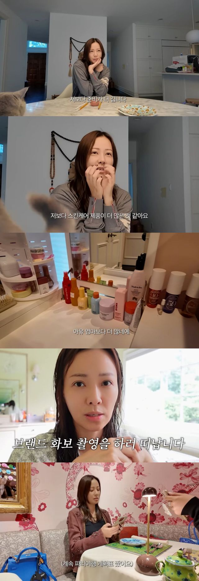 아들은 이미 학교에 갔고, 딸은 준비 중이라고 알린 그는 반려묘를 카메라에 인사 시키며 시간을 보내더니 "딸이 저보다 준비가 더 길다. 방에 화장대를 보면 정말 웃기다. 저보다 스킨케어 제품이 더 많은 것 같다"며 웃었다.