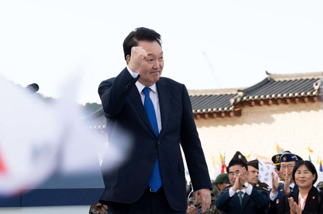 윤석열 대통령이 1일 오후 서울 세종대로 광화문광장 일대에서 열린 '건군 76주년 국군의날 시가행진'에서 국군장병들을 격려하고 있다. / 대통령실 제공