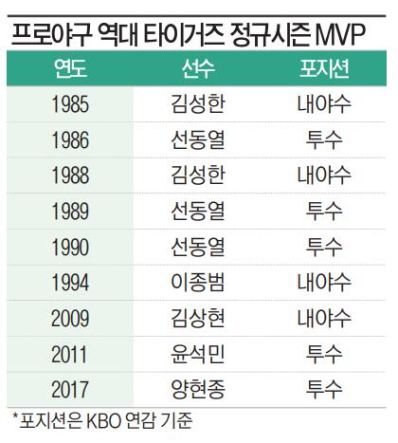 조심스럽게 '만장일치' 얘기가 나오기도 한다. KBO리그 역사상 MVP 투표에서 만장일치가 나온 건 원년인 1982년이 유일하다. 그해 '불사조' 박철순(당시 OB 베어스)이 22연승 신화와 함께 24승을 기록, MVP 후보로 단독 입후보한 뒤 수상했다. 박철순의 사례를 제외하면 2022시즌 기자단 투표에서 유효표 107표 중 104표를 획득한 이정후(당시 키움 히어로즈)의 97.2%가 최고 득표율이다. 타이거즈 출신 MVP는 2017년 투수 양현종이 마지막. 야수로는 2009년 김상현 이후 명맥이 끊겼다. 김도영이 타이거즈 역대 10번째 MVP 트로피를 들어 올릴 수 있을지 흥미롭다.