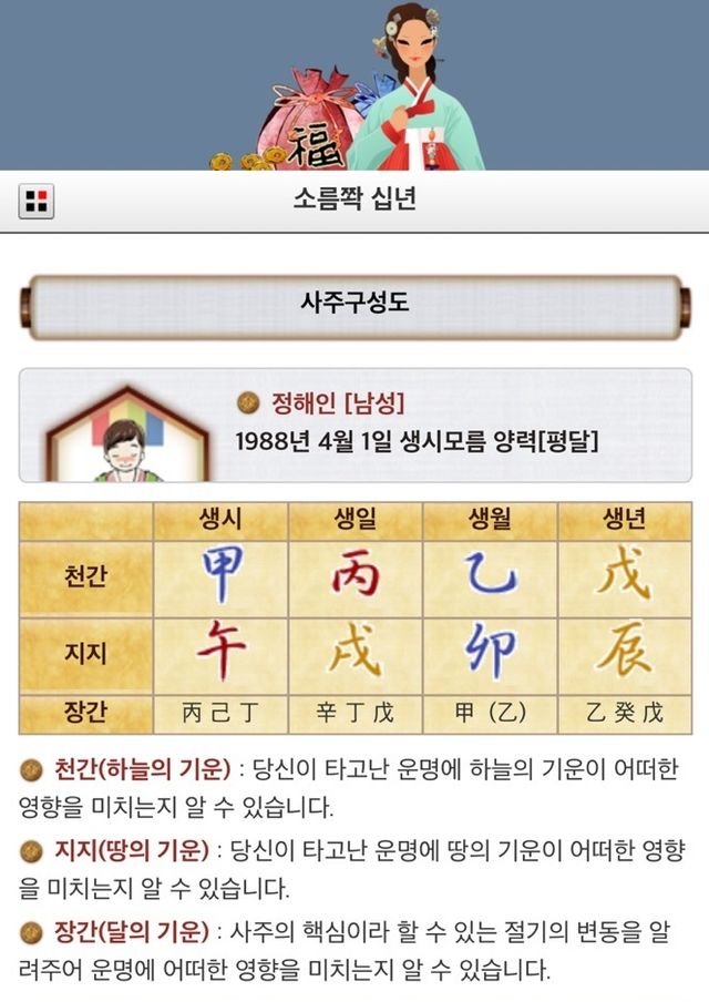 위키사주 소름쫙 십년 정해인 사주 화면 / 위키사주