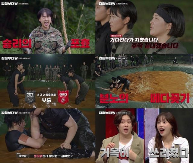 이수연은 곧장 각성한 듯 이현선을 번쩍 들어 참호 밖으로 내보냈다. 이수연과 박보람만 남은 가운데, 박보람은 이수연의 다리에 매달려 악착 같이 버텼다. “코끼리한테 밟히는 느낌”이라면서도 포기할 줄 모르는 박보람은 잠시 후 회심의 일격으로 이수연을 넘어뜨렸다. 과연 박보람의 기술과 이수연의 힘이 팽팽하게 맞붙은 가운데, 누가 승리할지는 다음 방송에서 공개된다.