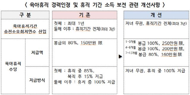 육아휴직 기간 중 소득 보전을 위해 육아휴직수당 지급액을 인상하고 대상 자녀와 무관하게 모든 육아휴직수당을 휴직 기간 중 전액 지급한다. 지역·기관을 미리 정해 채용된 구분모집자도 출산·양육을 위해 필요한 경우엔 예외적으로 필수보직기간(5년) 내 전보가 가능해진다.