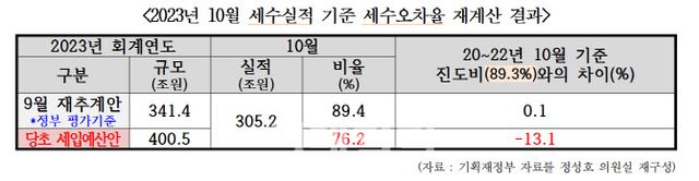지난해 9 월 재추계한 세입예산안 341조4000억원 대비 10월 세수 진도비가 89.4%(305조2000억원)로 , 직전 3년간 10월 평균인 89.3%와 비교해 불과 0.1% 차이라는 점을 근거 삼았다.