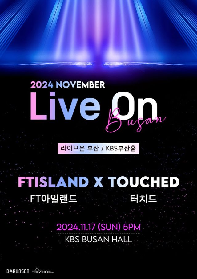 3일 바른손에 따르면 11월 27일 오후 5시 KBS부산홀에서 FT아일랜드와 터치드가 출연하는 문화공연 ‘라이브 온’(LIVE ON)이 열린다.