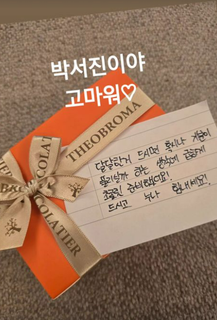 이와 함께 공개된 박서진의 편지에는 “달달한 거 드시면 혹시나 기분이 풀리실까봐 하는 생각에 급하게 초콜릿 준비했어요. 드시고 누나 힘내세요”라는 내용이 담겼다.
