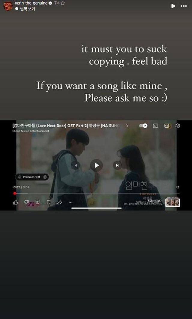백예린도 이날 자신의 인스타그램을 통해 표절에 대한 불쾌감을 드러냈다. 그는 "it must you to suck copying. feel bad. If you want a song like mine, Please ask me so(곡을 표절하다니 안타깝다. 비슷한 노래를 원한다면 나한테 부탁해라)"라고 말했다.