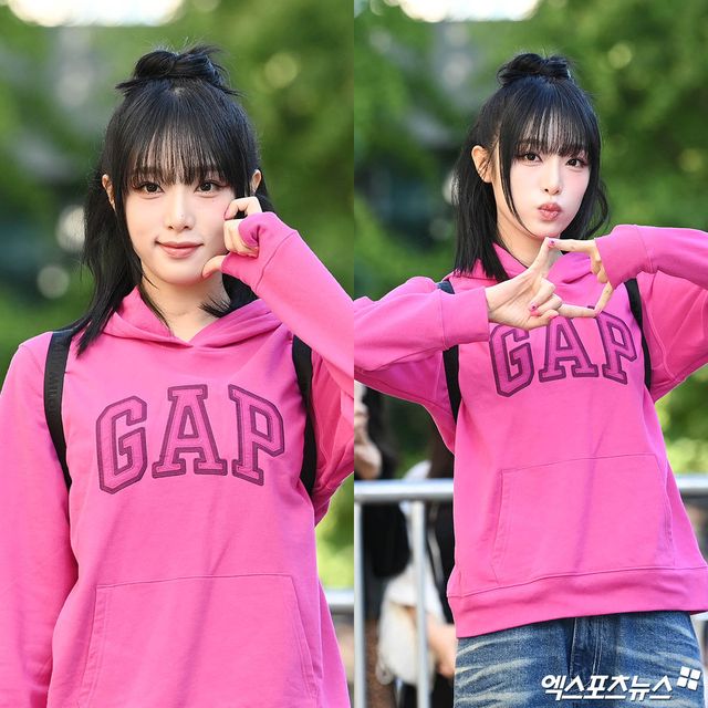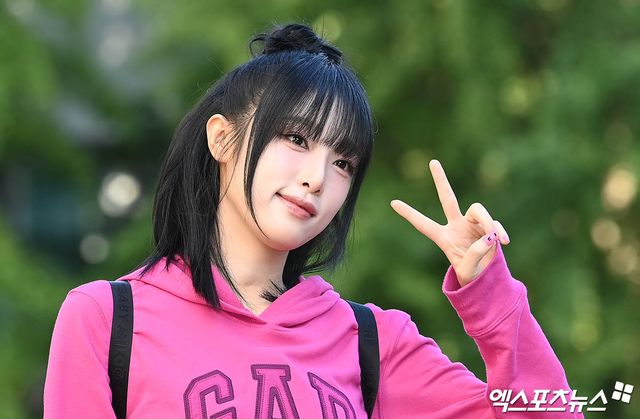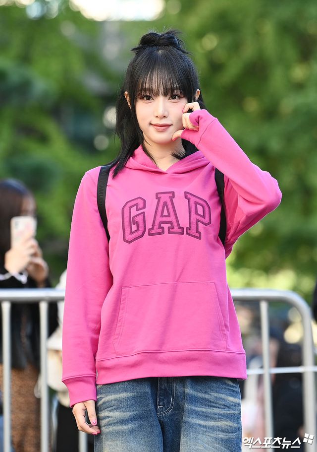가수 최예나가 출근길에 포즈를 취하고 있다.