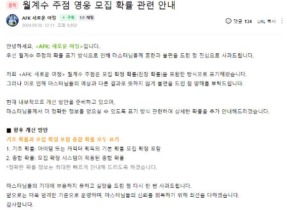4일 업계에 따르면 릴리스 게임즈는 '월계수 주점 영웅 모집 확률 관련 안내'라는 공지사항을 통해 확률 표기 방식의 오류에 대해 시인했다. 사측은 "'AFK' 월계수 주점은 모집 확정 확률(천장 확률)을 포함한 방식으로 표기해왔다"며 "내부적으로 개선방안을 준비 중"이라고 밝혔다.