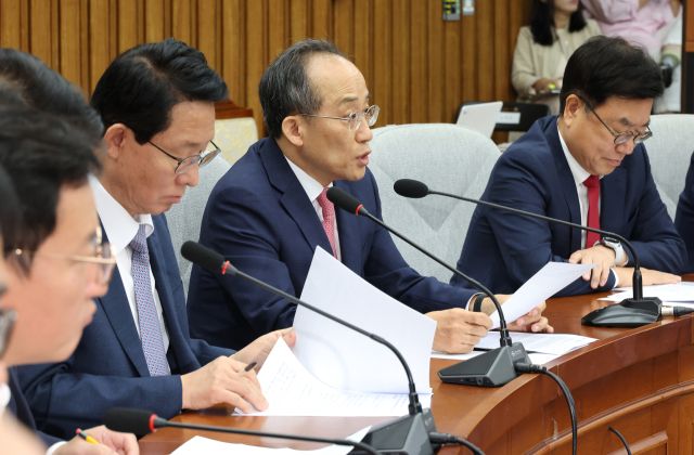 ▲국민의힘 추경호 원내대표(가운데)가 4일 오전 국회에서 열린 원내대책회의에서 발언하고 있다. ⓒ연합뉴스