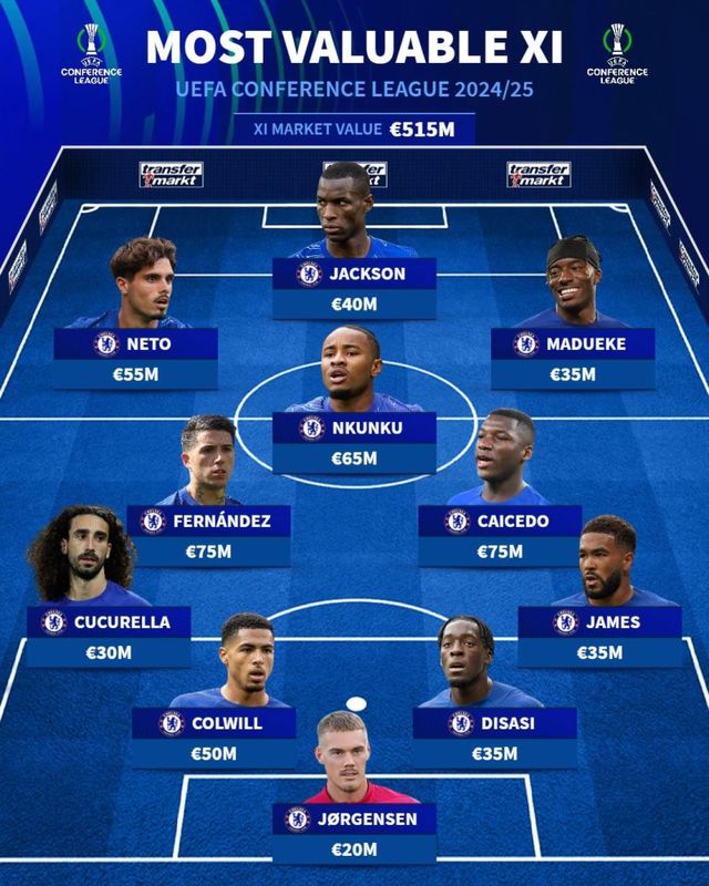 잉글랜드 프리미어리그(EPL) 첼시의 위엄일까. 한 축구 통계 매체가 유럽축구연맹(UEFA) 유로파콘퍼런스리그(UECL) 몸값 베스트11을 공개했는데, 첼시 선수들이 모든 자리를 차지해 눈길을 끌었다.