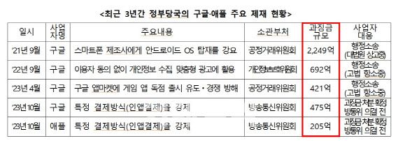 국회 과학기술정보방송통신위원회 소속 박충권 국민의힘 의원실이 한국모바일게임협회로부터 제출받은 자료에 따르면, 구글은 2021년부터 현재까지 공정거래위원회·개인정보보호위원회·방송통신위원회로부터 총 3837억원의 과징금 처분을 받았다. 애플은 방통위로부터 205억원의 과징금 처분을 받았다.
