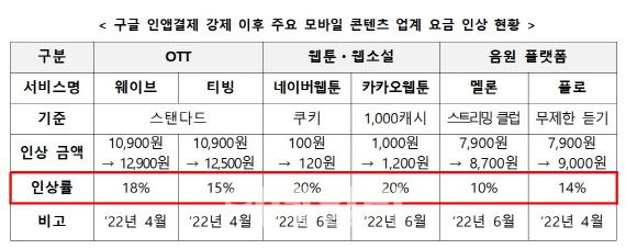 한국소비자원에 따르면 지난해 1분기 기준 구글은 원스토어보다 최고 59%, 애플은 76.9% 앱 결제 비용이 비싼 것으로 나타났다. 특히 구글이 2022년 4월부터 ‘아웃링크’ 등의 외부 결제방식을 금지하고, ‘인앱 결제(내부 결제)’를 강제함으로써 네이버웹툰과 멜론 등 주요 콘텐츠 요금 인상을 초래했다는 분석이 따른다.