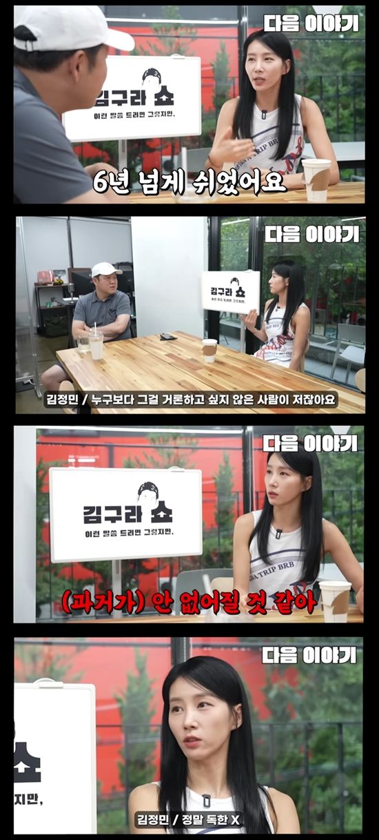 김구라가 "그럼에도 불구하고 나온 이유가 뭐냐"고 묻자, 김정민은 "과거가 안 없어질 것 같다. 화가 나 있다. 정말 독한 X처럼 보더라"라고 토로했다.