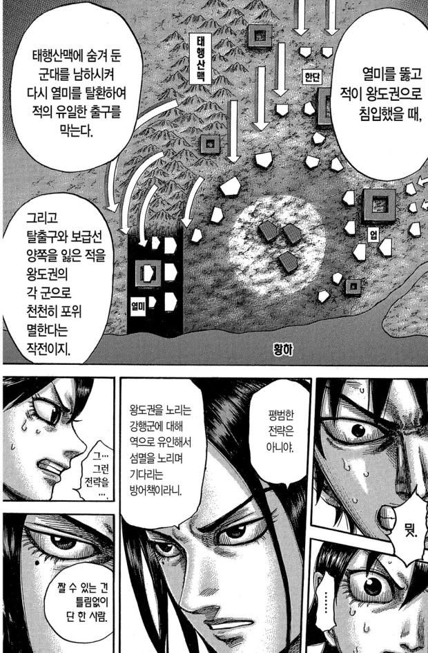 일부러 입구 요새인 열미성과 최중요 거점인 업을 진나라 군에게 넘겨준 다음 보급이 어려워서 굶주린 진군을 섬멸한다.