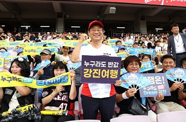 전라남도 강진군 관계자들이 야구장에서 반값 강진여행 관련 배너와 현수막을 들고 있다. / 강진군 제공