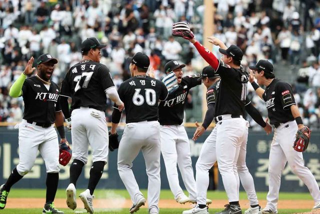 3일 오후 서울 송파구 잠실야구장에서 열린 프로야구 '2024 신한 SOL 뱅크 KBO리그' KT 위즈와 두산 베어스의 포스트시즌 와일드카드 결정전 2차전에서 1-0 승리를 거두며 준플레이오프 진출에 성공한 KT 선수들이 마운드에 모여 하이파이브를 하고 있다. 2015년 와일드카드 결정전 도입 후 5위 팀이 4위 팀을 제치고 준플레이오프에 올라간 경우는 이번이 처음이다. / 뉴스1
