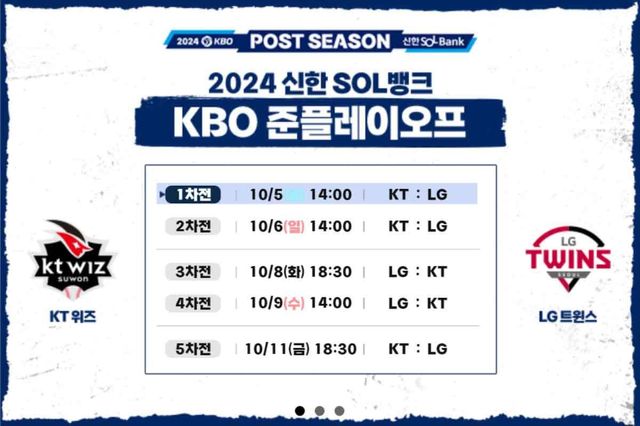 2024 신한 SOL뱅크 KBO 준플레이오프 KT·LG 경기 일정은 다음과 같다.