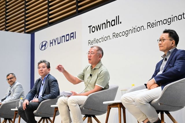 정의선 회장이 현대차 인도권역본부 델리 신사옥에서 열린 타운홀미팅에서 인도권역 현지 직원들의 질문에 답하고 있다. 사진=현대차 제공
