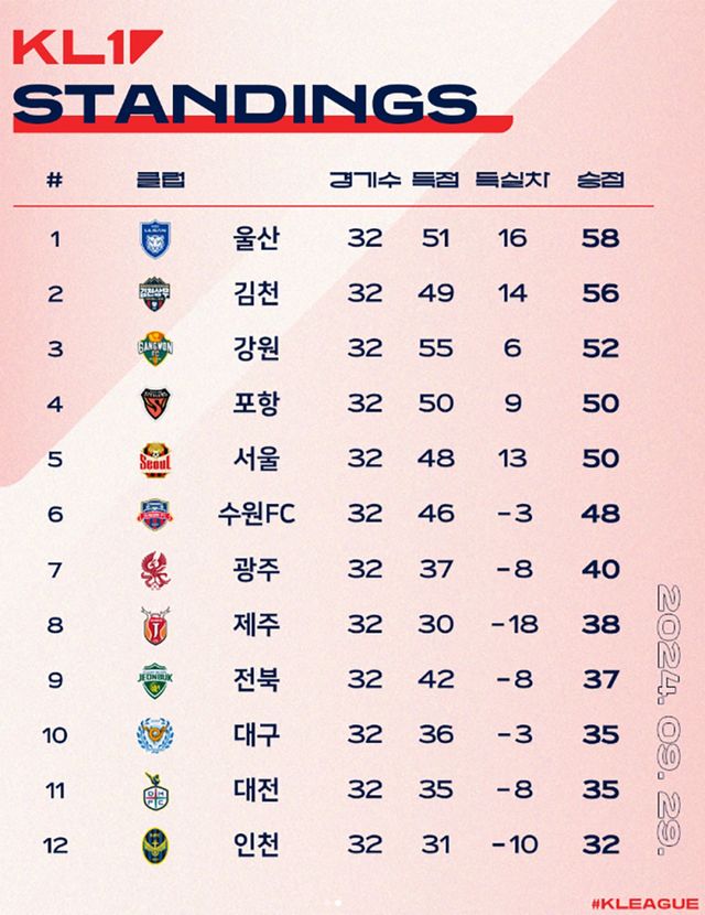 그런데 올해 정규 라운드 최종전은 다소 김이 빠졌다. 지난 31라운드를 기점으로 파이널 A그룹과 B그룹이 조기에 확정됐기 때문이다. 이번 시즌 우승과 2025~26시즌 아시아축구연맹(AFC) 챔피언스리그(ACL) 진출권을 두고 경합을 벌일 파이널 A그룹 팀은 울산 HD(승점 58)와 김천 상무(56), 강원FC(52), 포항 스틸러스, FC서울(이상 50), 수원FC(48)다.