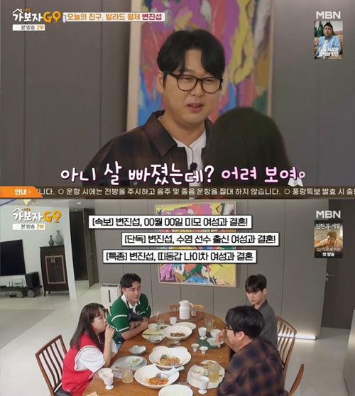 이후 변진섭이 직접 만든 요리를 함께 먹으며 이야기를 나누었다. MC들은 변진섭에게 12살 연하 미모의 아내와 어떻게 만났는지 물었다. 변진섭은 “지인과 약속을 잡았는데 당일 전화가 와서 약속을 취소하더라. 이유를 물었더니 선수촌에서 금요일만 외출이 가능한 지인을 만난다고 했다. 그래서 ‘그러면 같이 만나자’라고 했다. 그리고 ‘예쁘니?’라고 물었더니 ‘아휴 애기야. 19살이다’라고 했다. 아내와 함께 고깃집에 갔는데 너무 맛있게 먹더라. 그게 너무 예뻐 보이더라”라고 말했다.