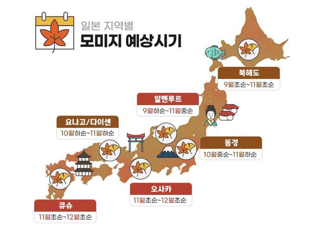 일본 지역별 단풍 예상시기 그래픽. / 모두투어