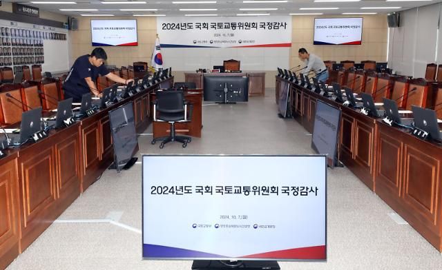 第22届国会首次国政审查即将拉开大幕,位于政府世宗大楼的国土交通部会议室内,工作人员正在布置会场。【图片提供 韩联社】