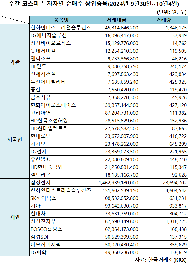 기관 '한화인더스트리얼솔루션즈'·외인 '한화에어로스페이스'·개인 '삼성전자' 1위 [주간 코스피 순매수- 9월30일~10월4일]