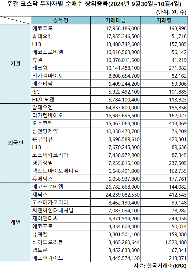 기관 '에코프로'·외인 '알테오젠'·개인 '에코프로비엠' 1위 [주간 코스닥 순매수- 9월30일~10월4일]