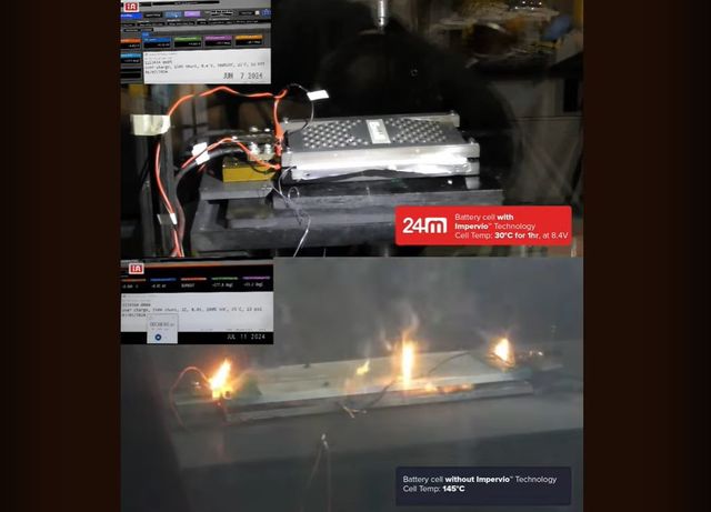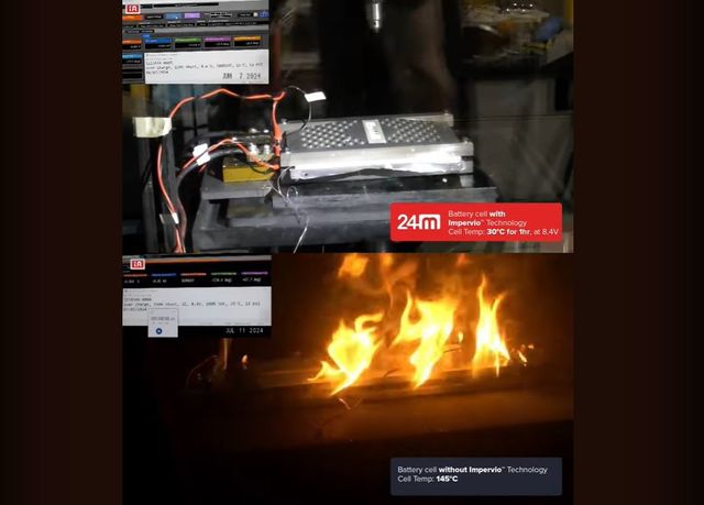 아래쪽 셀은 기성품이고 위쪽 셀은 24M의 임페르비오 분리막을 사용했으며, 결과는 그 효과를 증명한다. 보통의 셀은 테스트 절차를 시작한 지 약 38분 만에 화염에 휩싸여 섭씨 145도의 온도를 보였지만, 임페르비오 분리막을 사용한 24M 제작 셀은 1시간 테스트 동안 안정을 유지했고 섭씨 30도를 넘지 않았다.