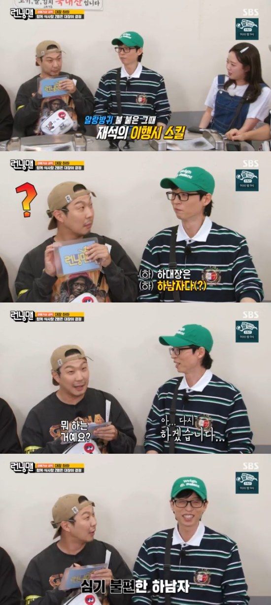 유재석은 "'하'하는 '하'남자다"라는 귀를 의심하게 만든 2행시를 선보였고, 이에 하하는 "지금까지 기분 좋았는데, 뭐하는 거예요?"라고 정색하며 황당해해 웃음을 자아냈다.