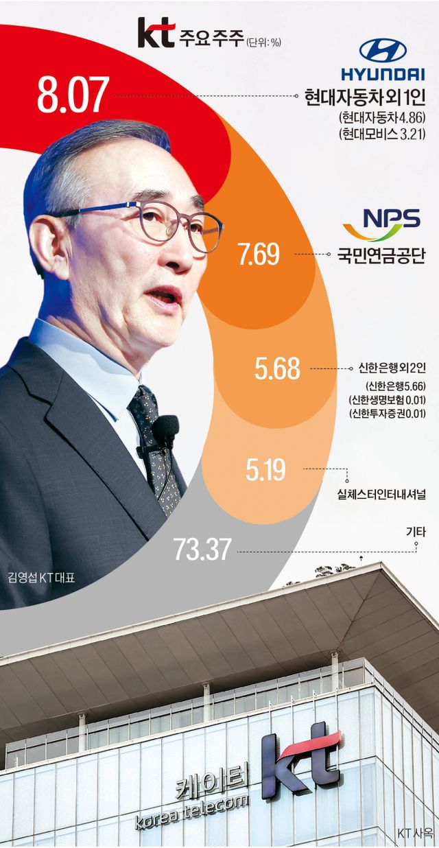 지난 4월 국민연금은 KT 지분을 8%대에서 7%대로 낮추면서 최대주주 자리를 현대차그룹에 넘겨줬다. 이에 현대차그룹(8.07%), 국민연금(7.69%), 신한은행(5.68%)의 순으로 주요 주주의 순위가 바뀌었다.