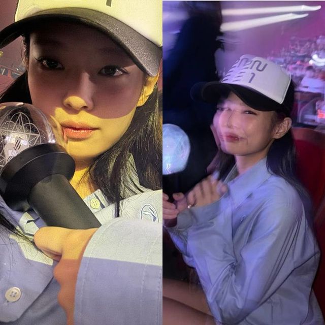 사진 속 제니는 투애니원 글자가 새겨진 캡 모자와 응원봉을 들고 팬심을 드러냈다. 패션 센스도 돋보였다. 제니는 오버사이즈 파란색 셔츠와 체크무늬 치마로 힙하면서도 러블리한 패션 무드를 자랑했다.