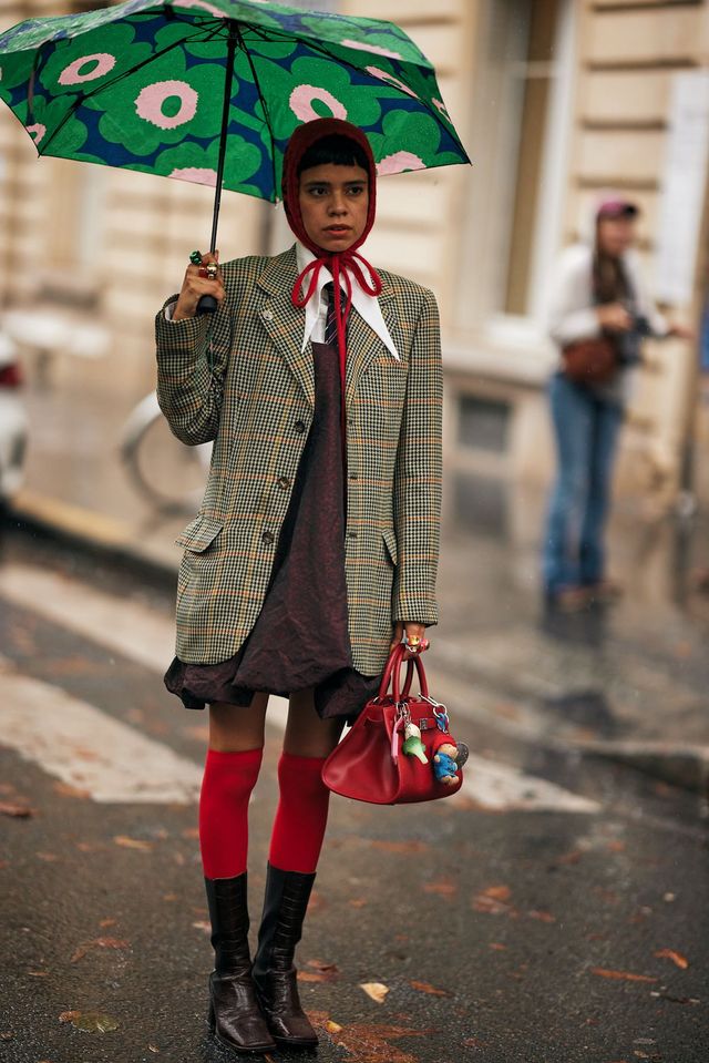 클래식과 팝을 믹스 매치한 신개념 프레피 룩도 포착됐습니다. 소녀스러운 무드에 장난기 넘치는 상상력을 한껏 발휘한 레드 컬러 악센트와 아빠 옷장에서 꺼낸 것만 같은 넥타이, 오버사이즈 체크무늬 재킷의 조화가 생경하면서도 개성 넘치네요.