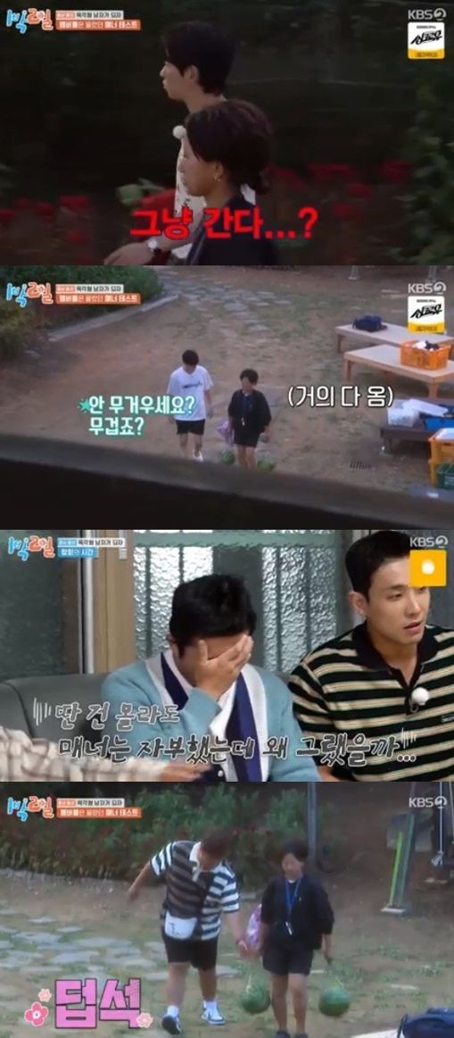 멤버들 중 문세윤만 막내작가가 든 수박 2통을 들어줬다. 문세윤을 제외한 '1박 2일' 모든 멤버들이 무거운 짐을 든 작가를 외면하고 지나쳤다는 것이 그대로 전파를 탔고, 이에 "연예인이 귀족이냐", "평소 인성 보인다" 등의 비판이 쏟아지고 있다.
