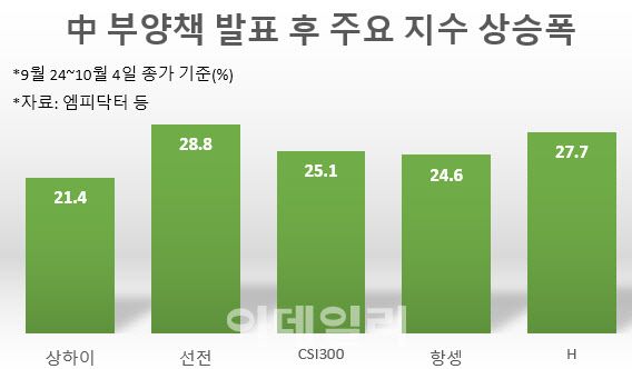 7일 엠피닥터 등에 따르면 중국 증시의 상하이종합지수와 선전종합지수는 중국 인민은행이 유동성 대책을 발표한 지난달 24일 이후 30일까지 5거래일간 각각 21.4%, 28.8% 올랐다. 중국 대표 벤치마크 지수인 CSI300지수는 같은기간 25.1% 상승했다.