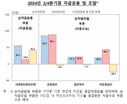 기업(비금융법인)은 순조달 규모가 확대됐다. 기업 순이익이 축소되고 고정자산 투자가 늘어난 영향이다. 순조달액은 23조7000억원으로 전분기(1조6000억원) 대비 22조1000억원 증가했다.