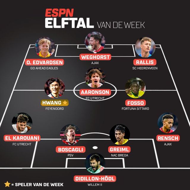 글로벌 스포츠 매체 ESPN 네덜란드판이 8일(한국시간) 2024-2025시즌 에레비디지 8라운드 이주의 팀을 선정해 발표했다.
