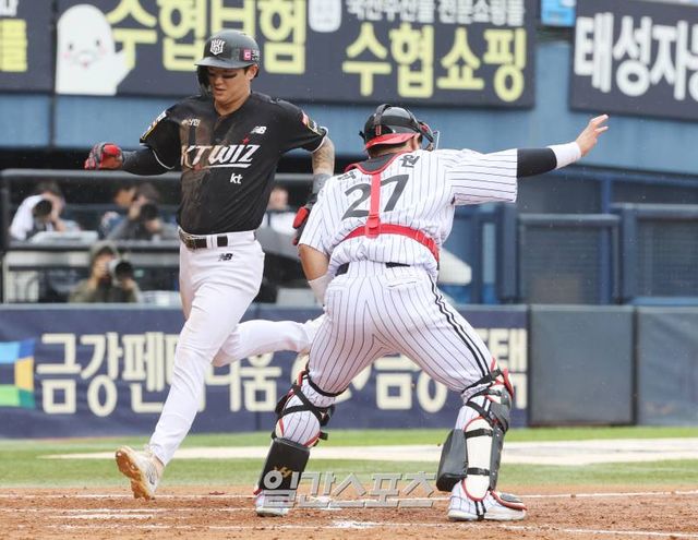 2024 프로야구 KBO 포스트시즌 LG트윈스와 kt위즈의 준플레이오프(준PO) 2차전 경기가 6일 오후 서울 잠실야구장에서 열렸다. 3회초 1사 1,3루 강백호의 희생플라이 때 3루 주자 김민혁이 여유있게 득점하고 있다. 잠실=김민규 기자 mgkim1@edaily.co.kr /2024.10.06/