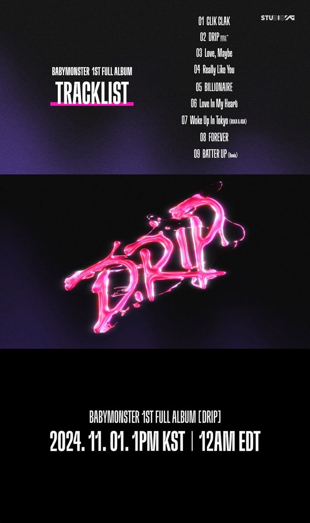 YG엔터테인먼트가 공식 블로그에 'YG Announcement BABYMONSTER 1ST FULL ALBUM ROLLOUT'을 게재하고, 오는 11월 1일 YG 신인 걸그룹 베이비몬스터의 첫 번째 정규 앨범 'DRIP'을 발매한다는 소식을 밝혔다.