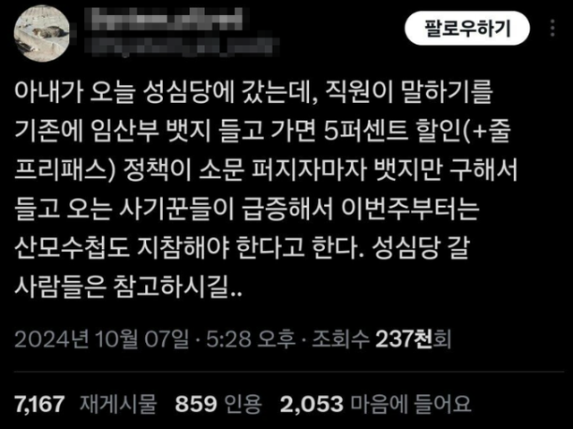 앞서 최근 엑스에는 "성심당에 임산부 배지나 산모 수첩 가지고 가면 줄 안 서고 바로 들어갈 수 있고, 5% 할인도 해준다"는 글이 올라왔다.
