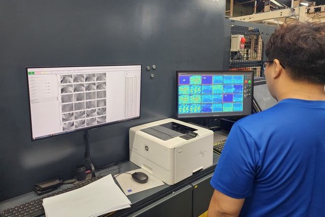 넥센타이어 직원들이 AI 제품 검사 자동화 플랫폼을 이용해 제품의 결함 유무를 판정하고 있다. ⓒ 넥센타이어
