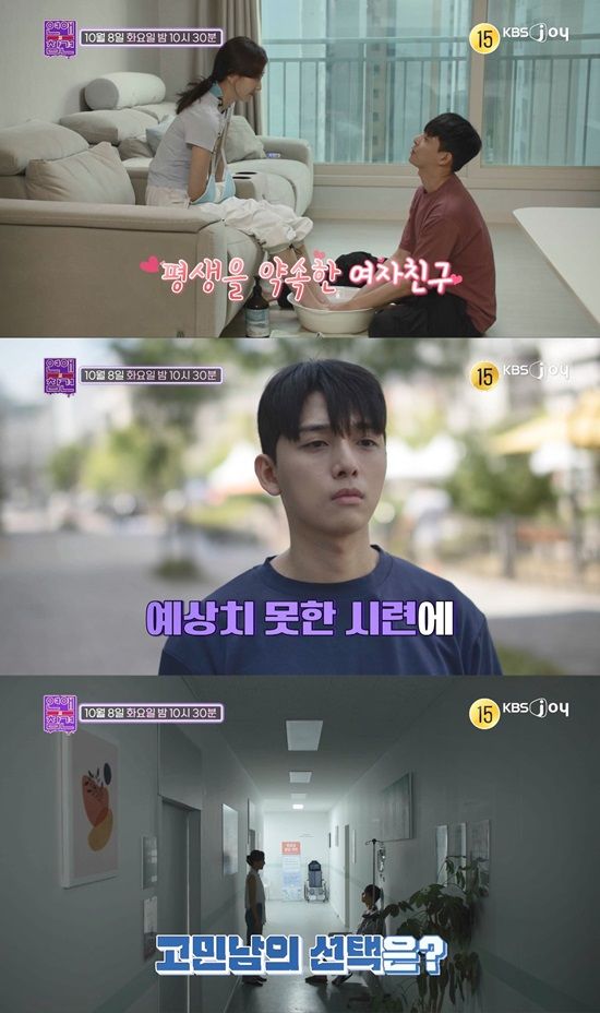 그런데 이별 한 달 후, 고민남은 암 3기 진단을 받게 된다. 여자친구도 진짜 끝이라 생각했는지 한 달째 아무 연락이 없었고, 그렇게 홀로 입원해 항암을 이어가던 고민남 앞에 전여자친구가 돌아온다.