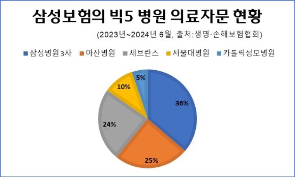 삼성보험이 다른 빅5 병원에 맡긴 의료자문 건수와 비교해도 상당히 높다. 같은 기간 병원별 의료자문 건수는 아산병원 1750건, 세브란스병원 1704건, 서울대병원 719건, 카톨릭성모병원 368건이다.
