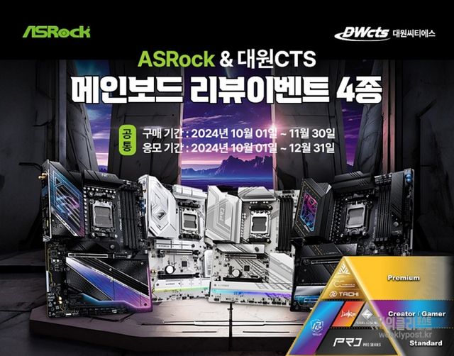 대원씨티에스가 가을씨즌 맞이 애즈락 메인보드 리뷰 작성 이벤트를 진행한다. 해당 이벤트는 애즈락의 다양한 메인보드를 구매한 고객을 대상으로 하며, 리뷰를 작성하면 모바일 상품권이 주어진다.