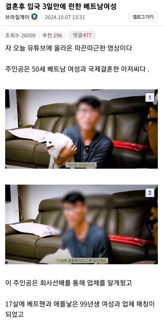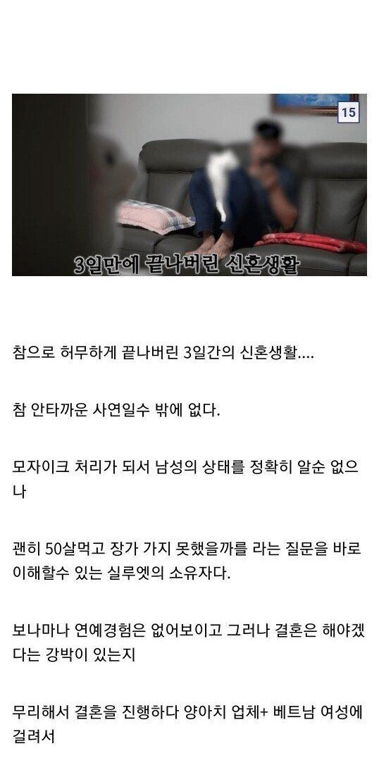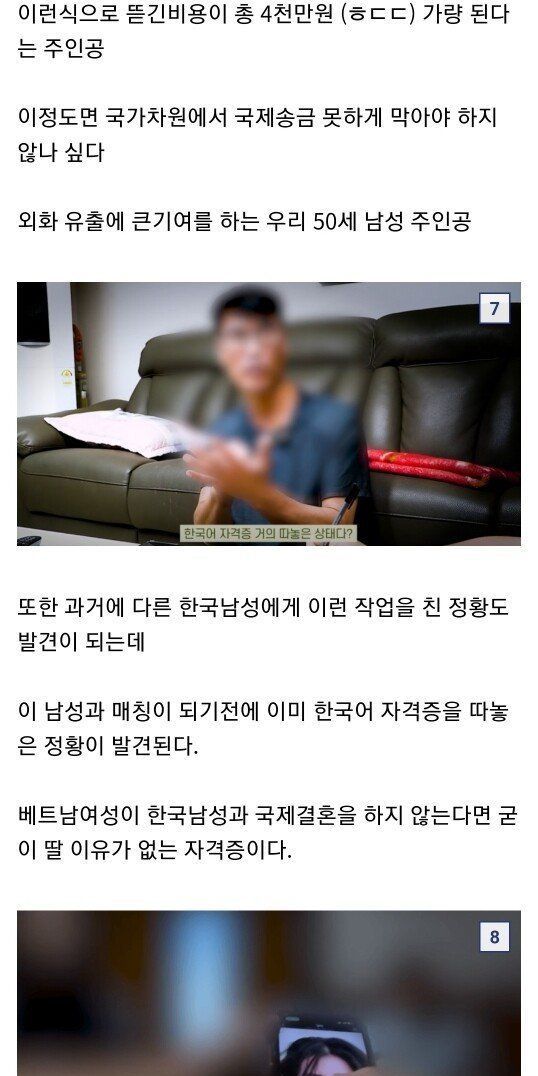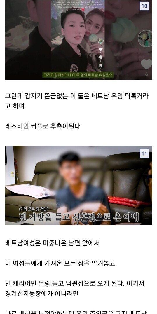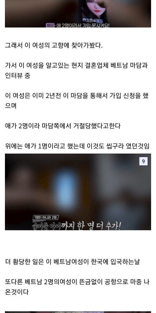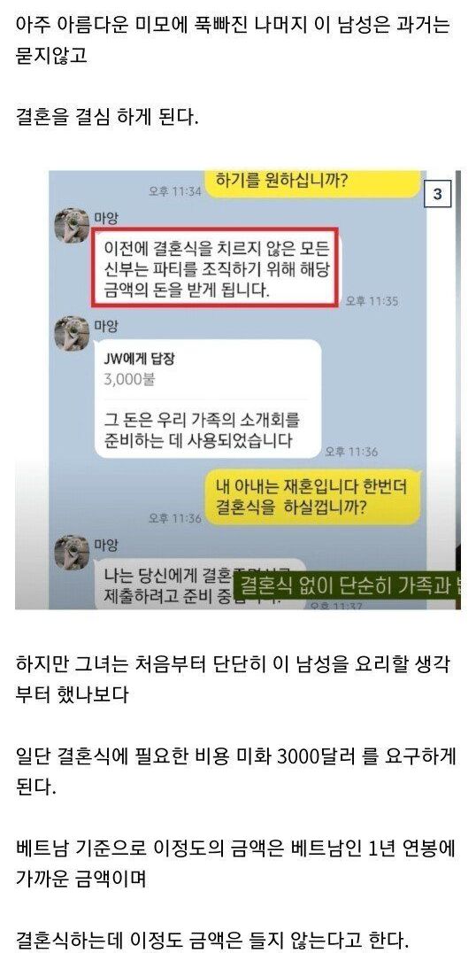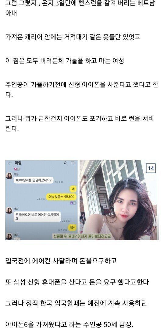 결혼 전 1천만원 추가 요구 -> 결혼 후 700만원 추가 요구 -> 입국하자마자 3일만에 도망감 -> 알고보니 애 두명 있음 -> 거기다 레즈비언이었음