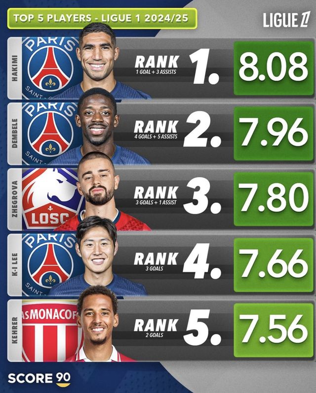 축구 콘텐츠 매체 SCORE 90은 8일(한국시간) 2024~25시즌 유럽 5대 리그 평균 평점 톱5를 공개했다. 축구 통계 매체 소파스코어의 평점을 기준으로 지금까지 평균 평점이 가장 높은 선수들을 조명한 것.