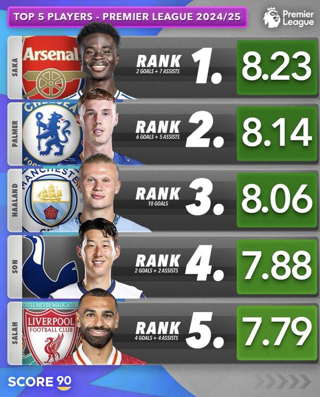 EPL에서는 부카요 사카(아스널)의 평균 평점이 8.23으로 가장 높았다. 그 뒤로는 콜 파머(첼시·8.14점) 엘링 홀란(맨체스터 시티·8.06점)이 차례로 이름을 올렸다. 손흥민 밑에 위치한 선수는 모하메드 살라(리버풀·7.79점)다.