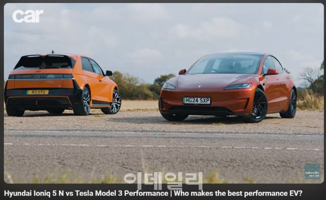 9일 자동차 업계에 따르면 영국의 자동차 전문지 ‘카 매거진’(Car Magazine)은 지난달 18일 유튜브 채널을 통해 아이오닉5 N과 테슬라 모델3 퍼포먼스의 비교 시승 콘텐츠를 공개했다. 이번 평가에서 아이오닉 5 N은 고성능 전기차 특유의 강력한 주행성능과 함께 크로스오버의 다재다능한 매력으로 카 매거진 평가단의 긍정적인 평가를 받았다.