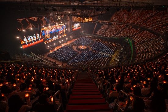 그 느낌은 공연장 내에 들어서는 순간 미묘하게 바뀌었다. 우선 무대 앞쪽으로 가깝게 제작된 초대형 스크린이 시선을 압도했고, 1층 객석 중심에 자리한 돌출 무대는 어떻게 활용될지 궁금증을 유발했다. 다소 차분하기까지 하던 팬들은 공연 시작 시간이 다가오자 하나, 둘씩 노래를 따라부르며 '떼창'으로 기다림을 표출했다.