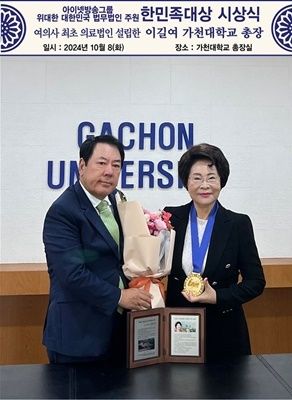 [전국=위키트리 최학봉 선임기자] 아이넷방송 박준희 회장은 8일(화) 오후 성남시 가천대학교 총장실에서 이길여 이사장에게 한민족감사패와 메달을 시상했다.